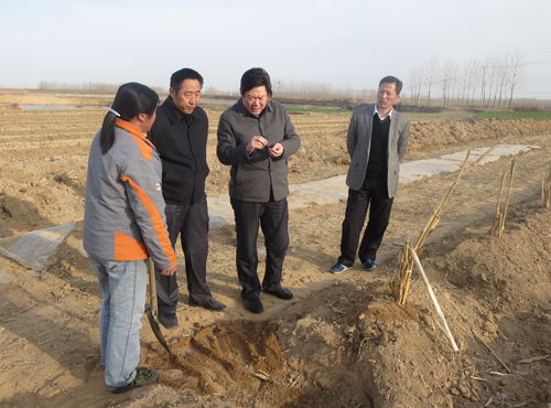 公司崔總陪同贛榆區(qū)委常委蘇長(zhǎng)曉(右二)和塔山鎮(zhèn)黨委書(shū)記檢查桃苗、核種植現(xiàn)場(chǎng)