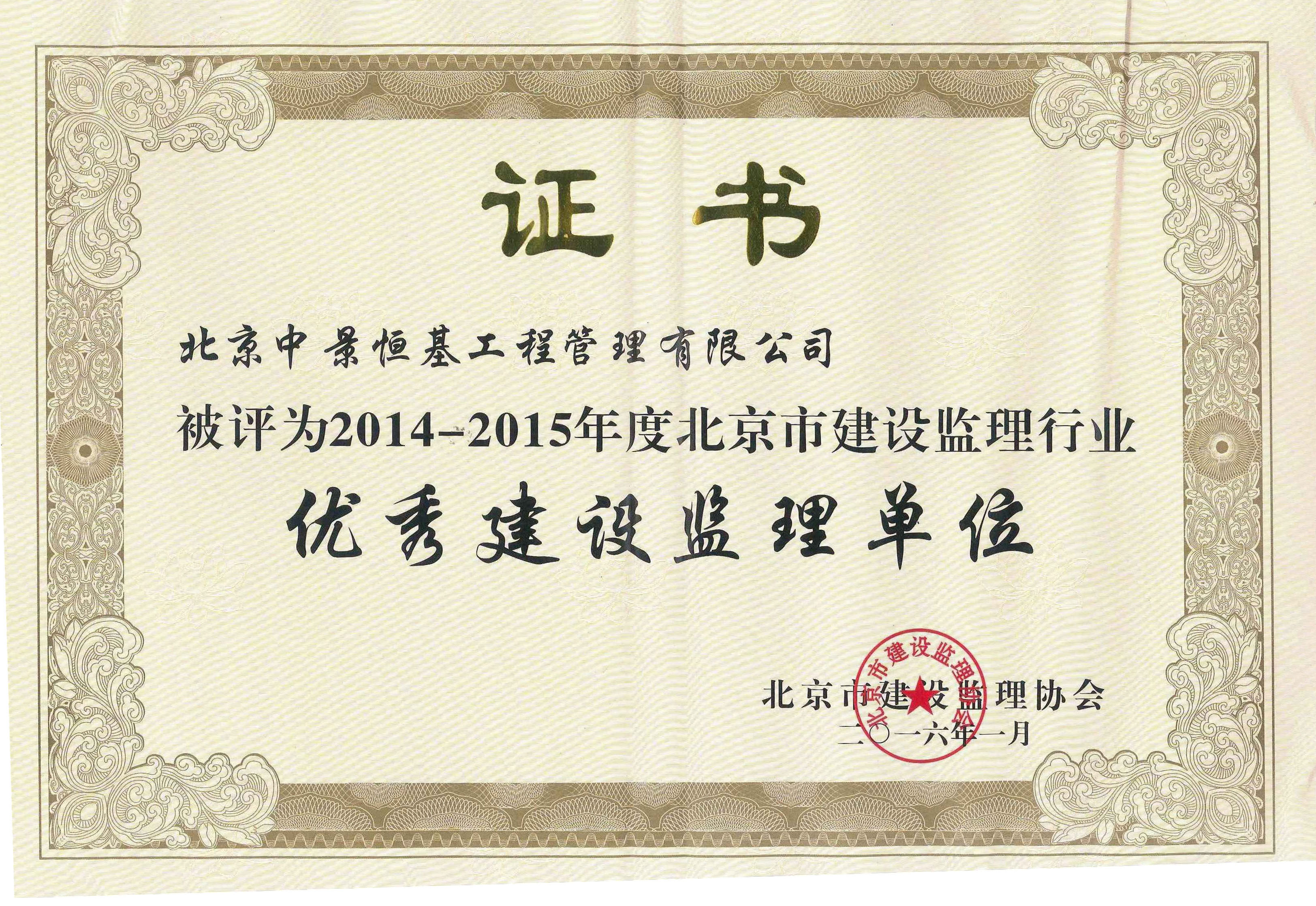 “優(yōu)秀建設(shè)監(jiān)理單位”榮譽(yù)證書