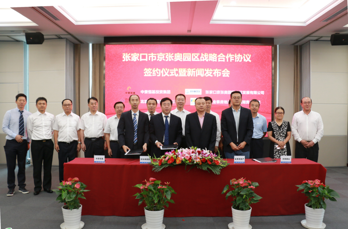 9月15日,中景恒基與京張奧園建、金泰地產(chǎn)、京糧置業(yè)舉行戰(zhàn)略合作協(xié)議簽約儀式。張家口市宣化區(qū)政府區(qū)長(zhǎng)費(fèi)再宏、副區(qū)長(zhǎng)毛飛、政府顧問(wèn)王文梅、京張奧園區(qū)管委會(huì)副主任李占魁,中景恒基集團(tuán)董事長(zhǎng)肖厚忠、總裁張睿、高級(jí)總裁時(shí)亮、高級(jí)總裁張峰,京張奧園建公司總經(jīng)理閆永貴,北京京糧置業(yè)有限公司執(zhí)行董事總經(jīng)理杜君、副總經(jīng)理劉穎坤、投資拓展部部長(zhǎng)王資,北京金泰房地產(chǎn)開發(fā)有限責(zé)任公司董事長(zhǎng)蔡洪福、總經(jīng)理馬強(qiáng)、副總經(jīng)理秦海鵬、投資部高級(jí)經(jīng)理張秋,中景商業(yè)管理公司副總經(jīng)理葉廣云、張?jiān)疲本┢囆袠I(yè)協(xié)會(huì)副會(huì)長(zhǎng)兼秘書長(zhǎng)夏寶山,北京國(guó)際綠色經(jīng)濟(jì)協(xié)會(huì)執(zhí)行會(huì)長(zhǎng)鄧?yán)^海等出席簽約儀式。全國(guó)10余家主流媒體應(yīng)邀參會(huì),并進(jìn)行了相關(guān)報(bào)道。