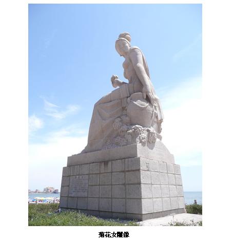 我們旅行的第一站是以美麗海景著稱的菊花島。興城海濱浴場綿延十四公里,是我國北方最大的天然浴場。這里的海水深淺適宜,水面平穩(wěn),水波清澈見底;岸邊沙灘細軟晶瑩;海岸上地勢開闊,綠樹掩映,是大海賜予人間的一片天然樂園。我們所在的興海灣是興城海濱最迷人的一段。步入濱海大道,放眼望去,是一座四柱三門二樓單檐廡殿門式正門,牌坊上是書畫家范曾題寫的“洪波涌起”和“古城在望”八個大字。越過此坊,便走進如詩如畫的興海灣:入口處一尊用花崗巖雕琢的高大的菊花女塑像正頷首相迎。菊花女是美麗、善良、勇敢、智慧和自我犧牲的精神化身,是興城人民心目中的英雄。