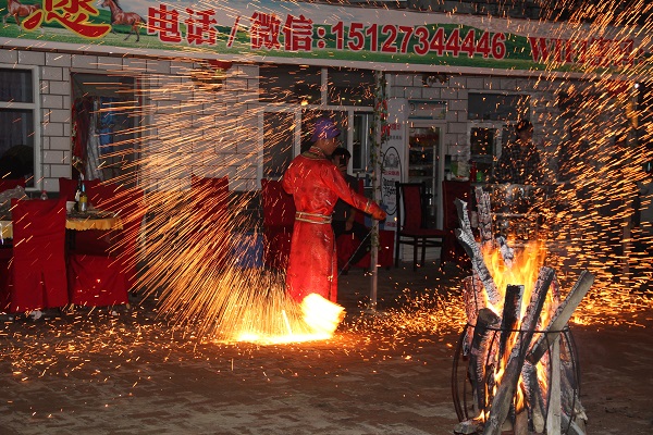 傍晚時分,品嘗完農(nóng)莊美味的佳肴,大家一起手拉手圍繞著冉冉篝火,唱起讓人心醉的蒙古歌,跳起優(yōu)美的安代舞,欣賞著火星四濺的打鐵花,載歌載舞,放飛心情。